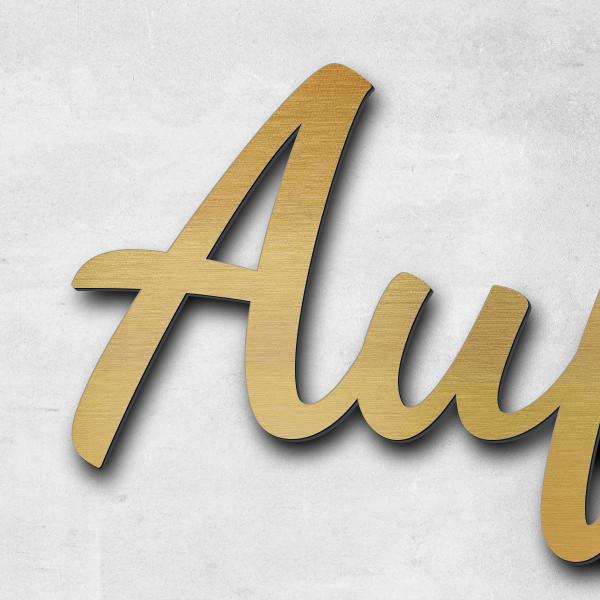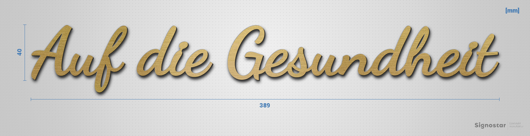 Hochwertiger, witterungsbeständiger Schriftzug "Auf die Gesundheit" aus Acryl-Kunststoff mit Oberfläche in Messing-Optik, gebürstet