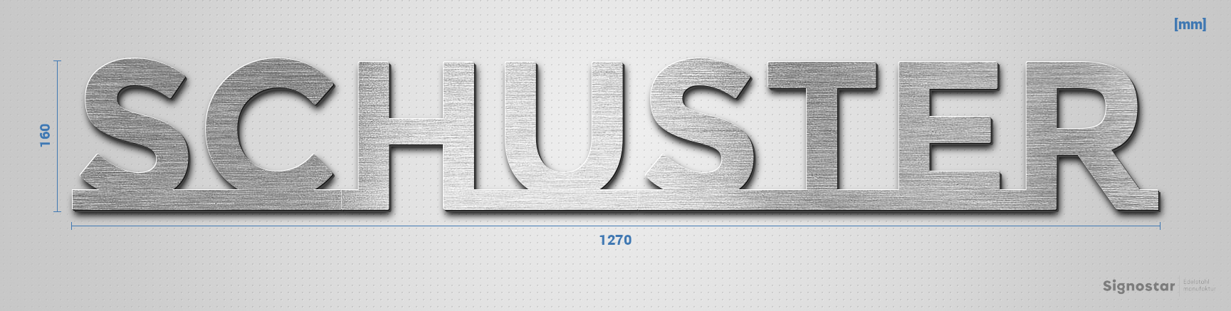 Hochwertiger, witterungsbeständiger Schriftzug "schuster" aus gebürstetem Edelstahl V2A (1.4301)