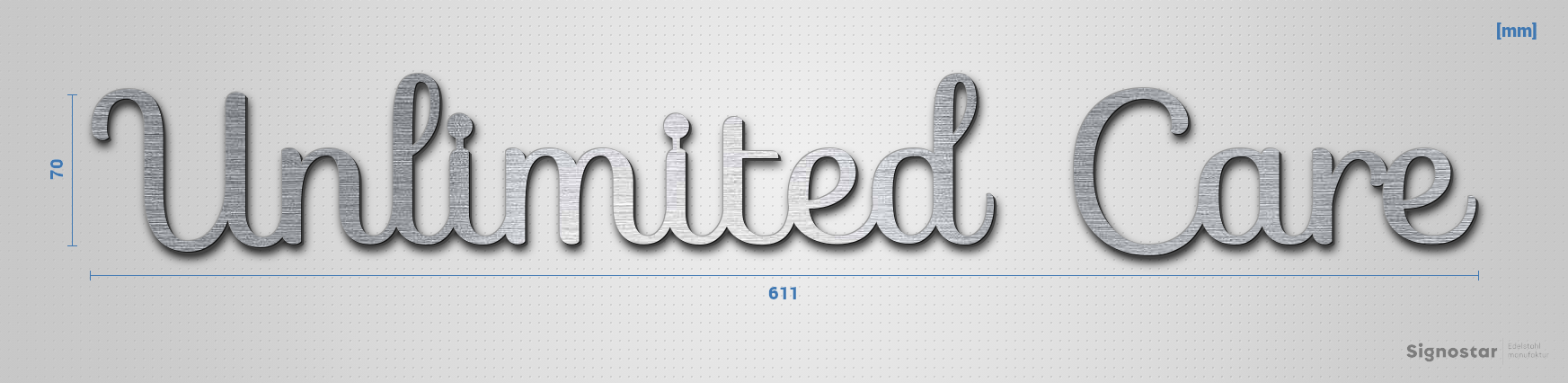 Schriftzug "Unlimited Care" in Schriftart "Autumna", Acryl-Kunststoff in Edelstahl-Optik gebürstet -