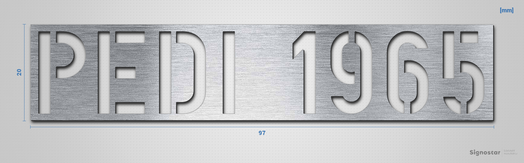 Hochwertiger, witterungsbeständiger Schriftzug "PEDI 1965" aus Acryl-Kunststoff mit Oberfläche in Edelstahl-Optik, gebürstet