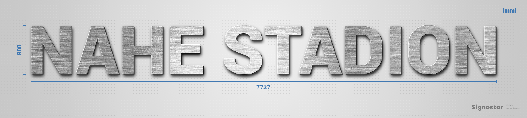 Hochwertiger, witterungsbeständiger Schriftzug "NAHE STADION" aus gebürstetem Edelstahl V2A (1.4301)