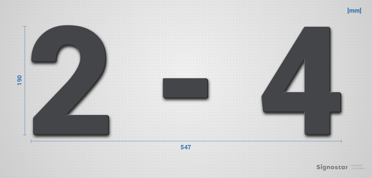 Schriftzug "2 - 4" in Schriftart "Sans", Edelstahl V2A pulverbeschichtet - hochwertig & wetterbestän
