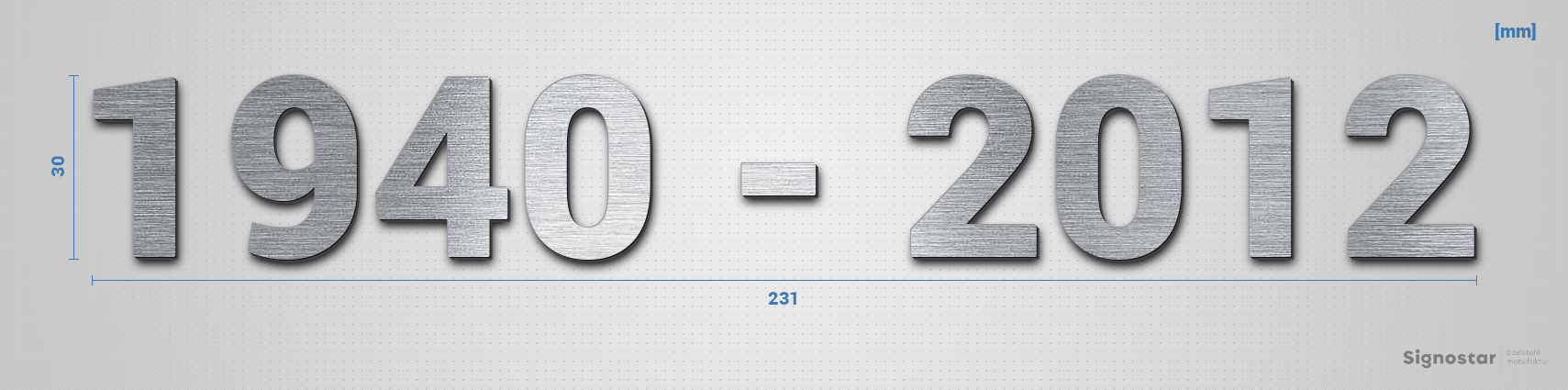 Hochwertiger, witterungsbeständiger Schriftzug "1940 - 2012" aus Acryl-Kunststoff mit Oberfläche in Edelstahl-Optik, gebürstet