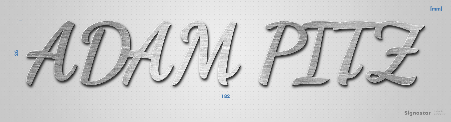 Schriftzug "ADAM PITZ" in Schriftart "Filigrano", Edelstahl V2A gebürstet - hochwertig & wetterbestä