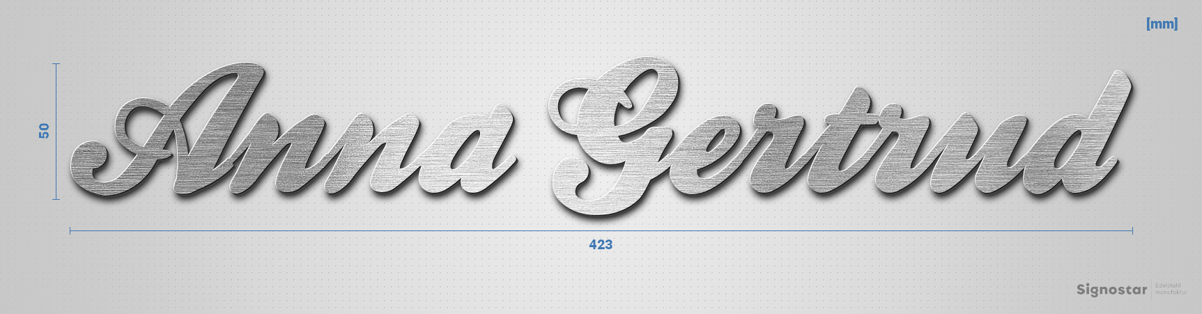 Hochwertiger, witterungsbeständiger Schriftzug "Anna Gertrud" aus gebürstetem Edelstahl V4A (1.4571)