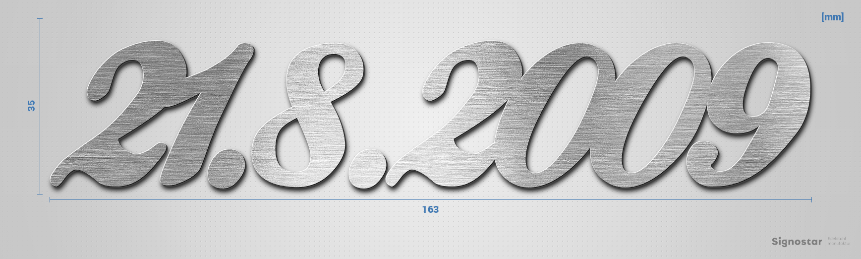 Schriftzug "21.8.2009" in Schriftart "Ballpark", Edelstahl V4A gebürstet - hochwertig & wetterbestän