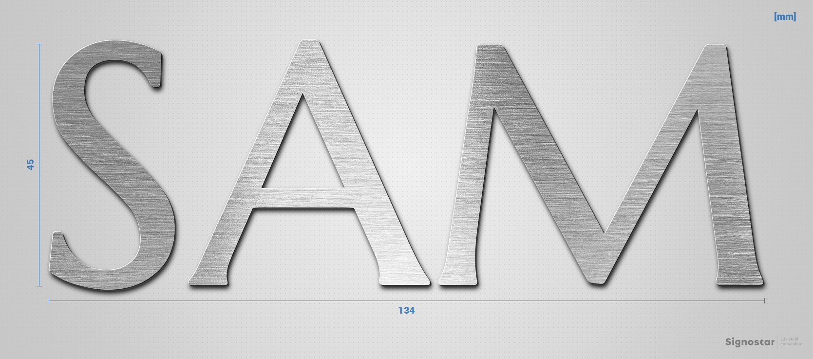 Schriftzug "SAM" in Schriftart "Eternitas", Edelstahl V2A gebürstet - hochwertig & wetterbeständig