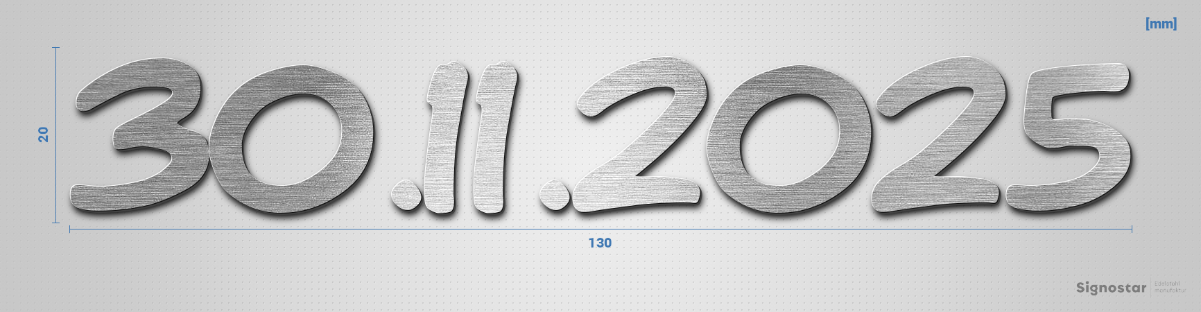 Schriftzug "30.11.2025" in Schriftart "Lilly", Edelstahl V2A gebürstet - hochwertig & wetterbeständig