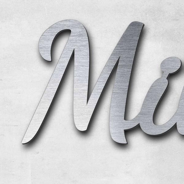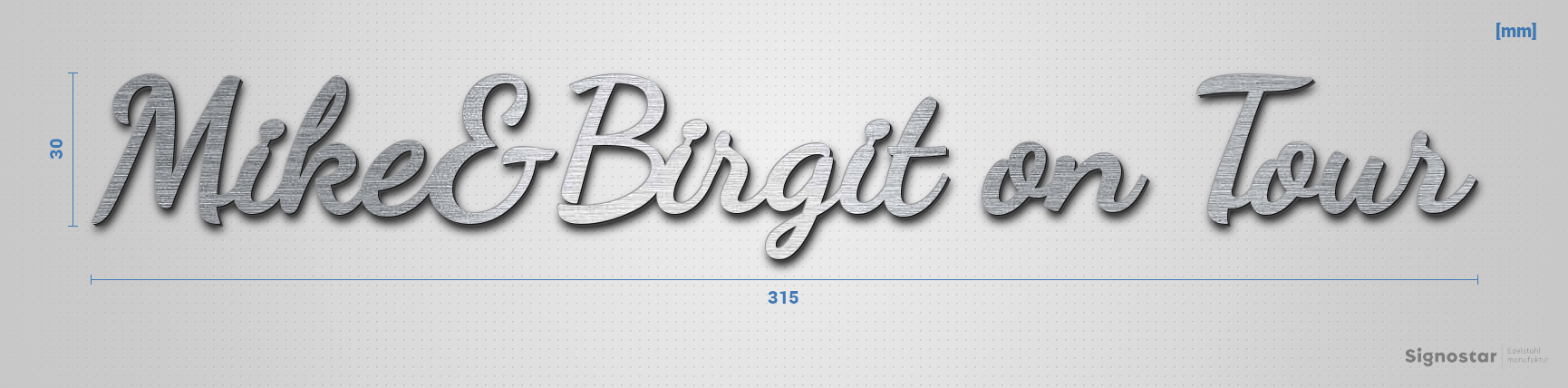 Schriftzug "Mike&Birgit on Tour" in Schriftart "Filigrano", Acryl-Kunststoff in Edelstahl-Optik gebürstet - hochwertig & wetterbeständig