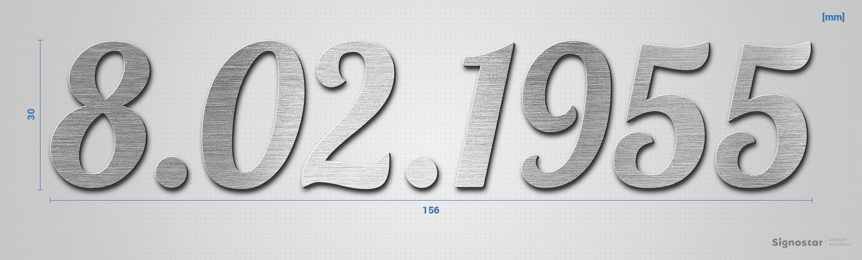 Hochwertiger, witterungsbeständiger Schriftzug "8.02.1955" aus gebürstetem Edelstahl V2A (1.4301)