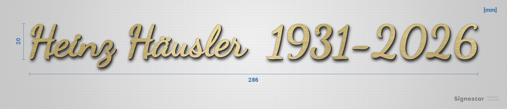 Schriftzug "Heinz Häusler 1931-2026" in Schriftart "Filigrano", Acryl-Kunststoff in Messing-Optik gebürstet - hochwertig & wetterbeständig