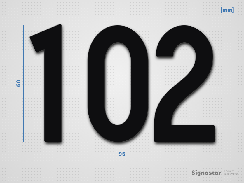 High-quality, weather-resistant lettering "102" made of powder-coated Stainless steel V2A (1.4301)