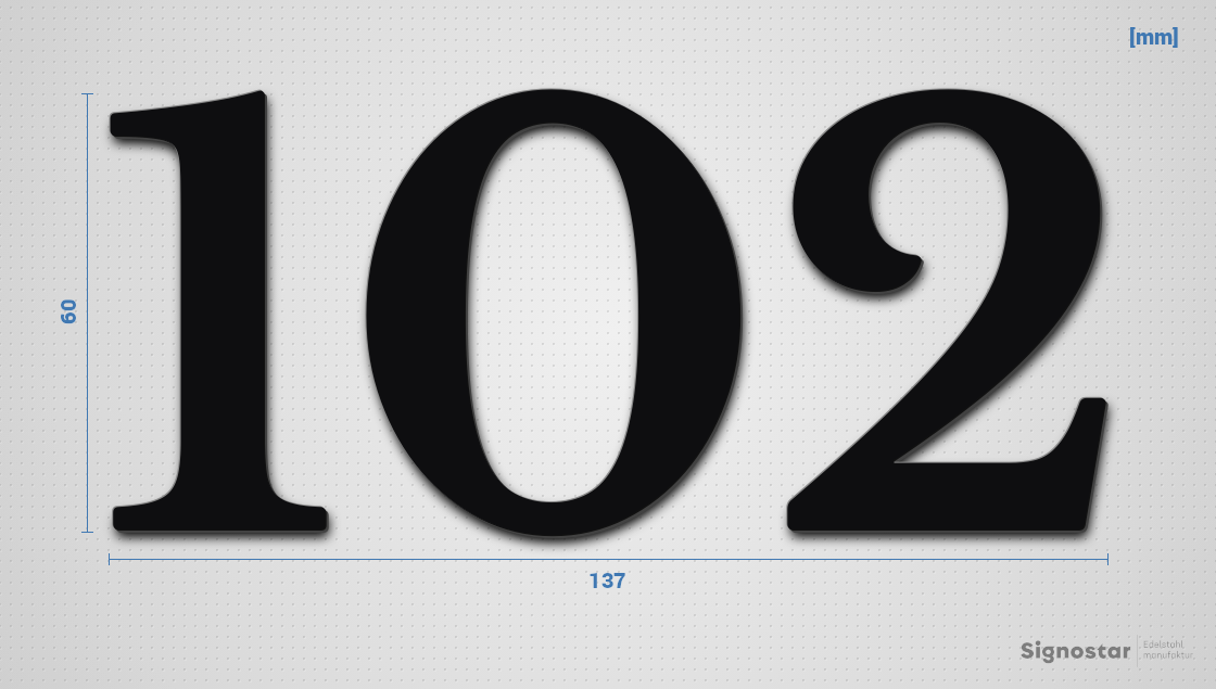 High-quality, weather-resistant lettering "102" made of powder-coated Stainless steel V2A (1.4301)