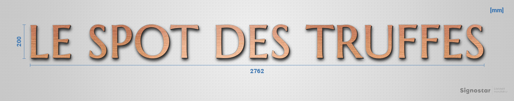 Lettering "LE SPOT DES TRUFFES", acrylic plastic in Aspect cuivre brushed - high quality & weather resistant