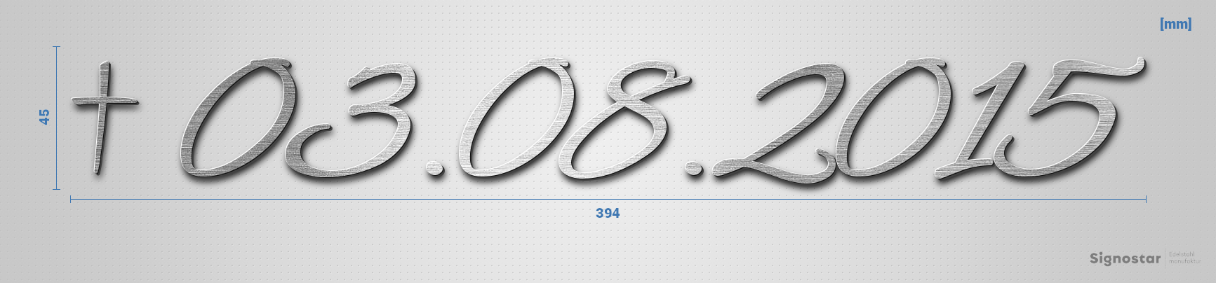 Hochwertiger, witterungsbeständiger Schriftzug "† 03.08.2015" aus gebürstetem Edelstahl V2A (1.4301)