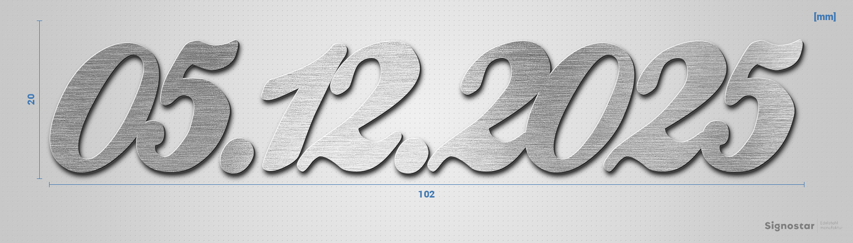 Schriftzug "05.12.2025" in Schriftart "Ballpark", Edelstahl V2A gebürstet - hochwertig & wetterbestä