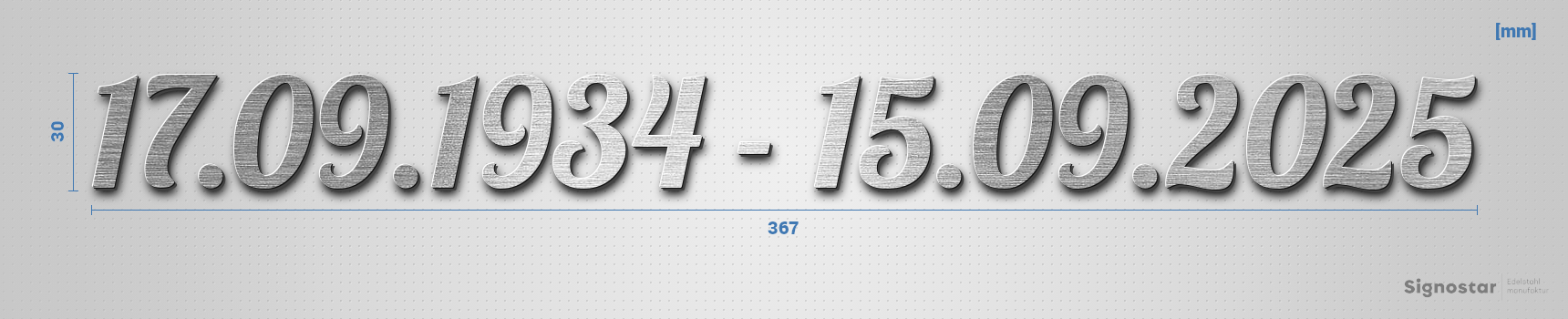 Schriftzug "17.09.1934 - 15.09.2025" in Schriftart "Catdog", Edelstahl V2A gebürstet - hochwertig &