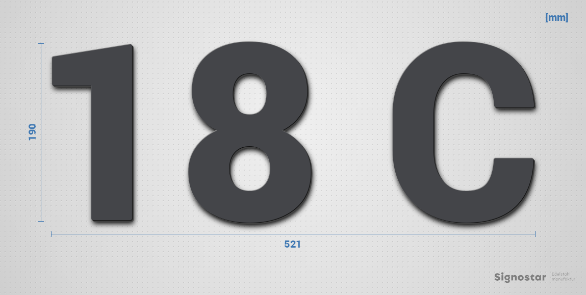 Schriftzug "18 C" in Schriftart "Sans", Edelstahl V2A pulverbeschichtet - hochwertig & wetterbeständ