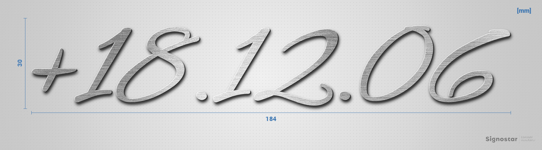 Hochwertiger, witterungsbeständiger Schriftzug "+18.12.06" aus gebürstetem Edelstahl V2A (1.4301)
