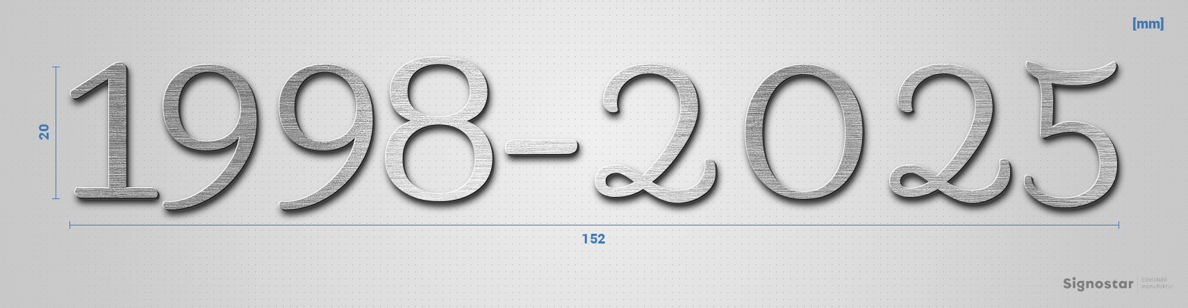 Hochwertiger, witterungsbeständiger Schriftzug "1998-2025" aus gebürstetem Edelstahl V2A (1.4301)