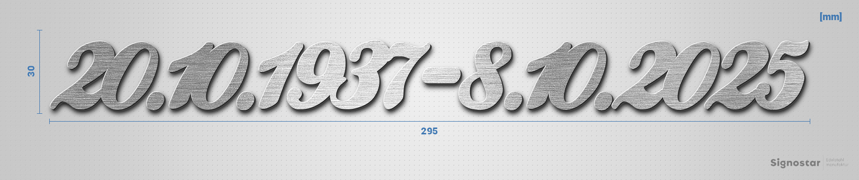 Schriftzug "20.10.1937-8.10.2025" in Schriftart "Ballpark", Edelstahl V2A gebürstet - hochwertig & w