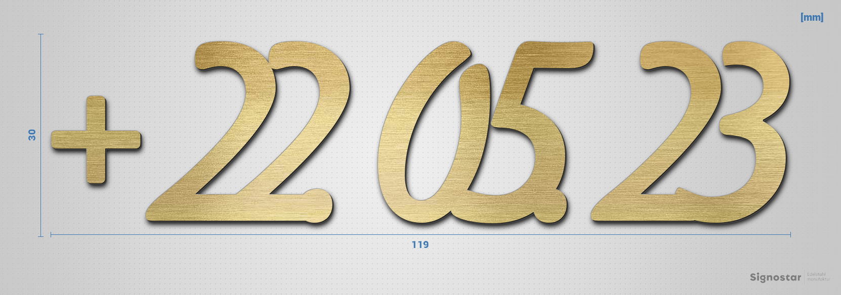 Schriftzug "+22.05.23" in Schriftart "Scriptus", Acryl-Kunststoff in Messing-Optik gebürstet - hochw