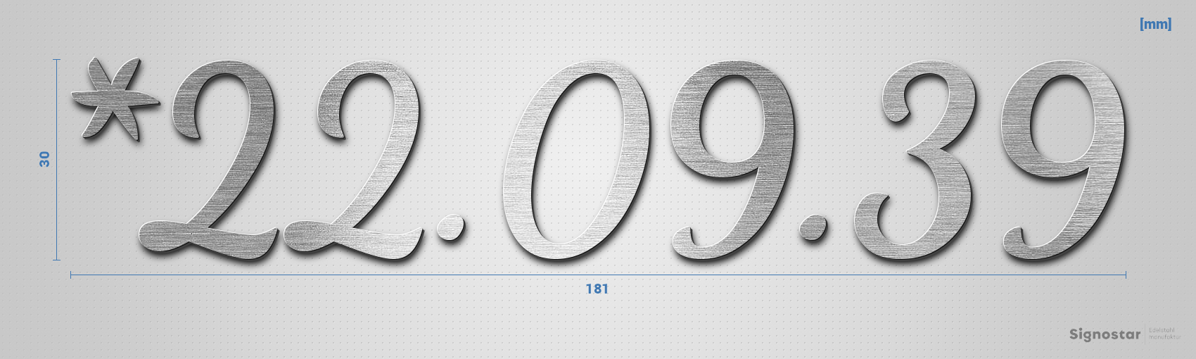 Schriftzug "*22.09.39" in Schriftart "Filigrano", Edelstahl V2A gebürstet - hochwertig & wetterbestä