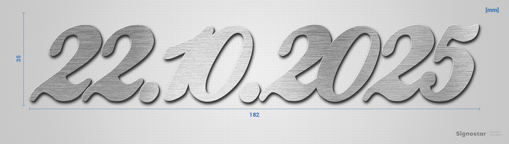 Schriftzug "22.10.2025" in Schriftart "Ballpark", Edelstahl V4A gebürstet - hochwertig & wetterbestä