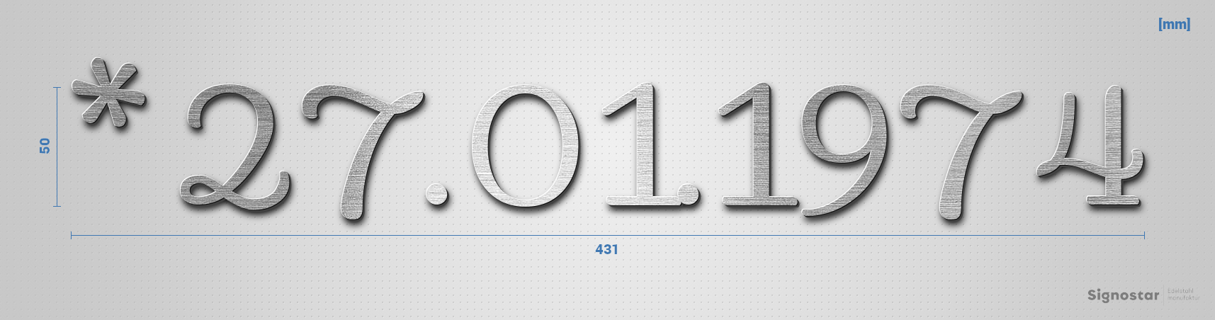Hochwertiger, witterungsbeständiger Schriftzug "*27.01.1974" aus gebürstetem Edelstahl V4A (1.4571)