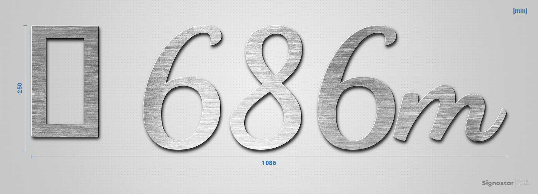 Schriftzug "?️ 686m" in Schriftart "Filigrano", Edelstahl V2A gebürstet - hochwertig & wetterbeständ