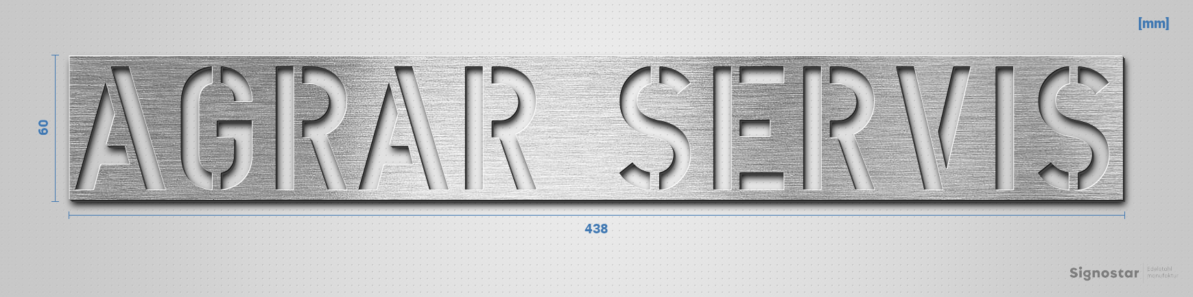 Schriftzug "agrar Servis" in Schriftart "Blash", Edelstahl V2A gebürstet - hochwertig & wetterbestän