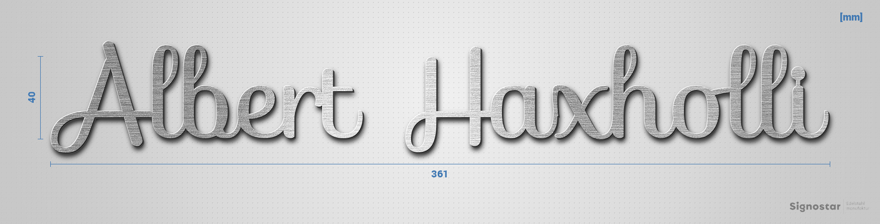 Schriftzug "Albert Haxholli" in Schriftart "Autumna", Edelstahl V2A gebürstet - hochwertig & wetterb