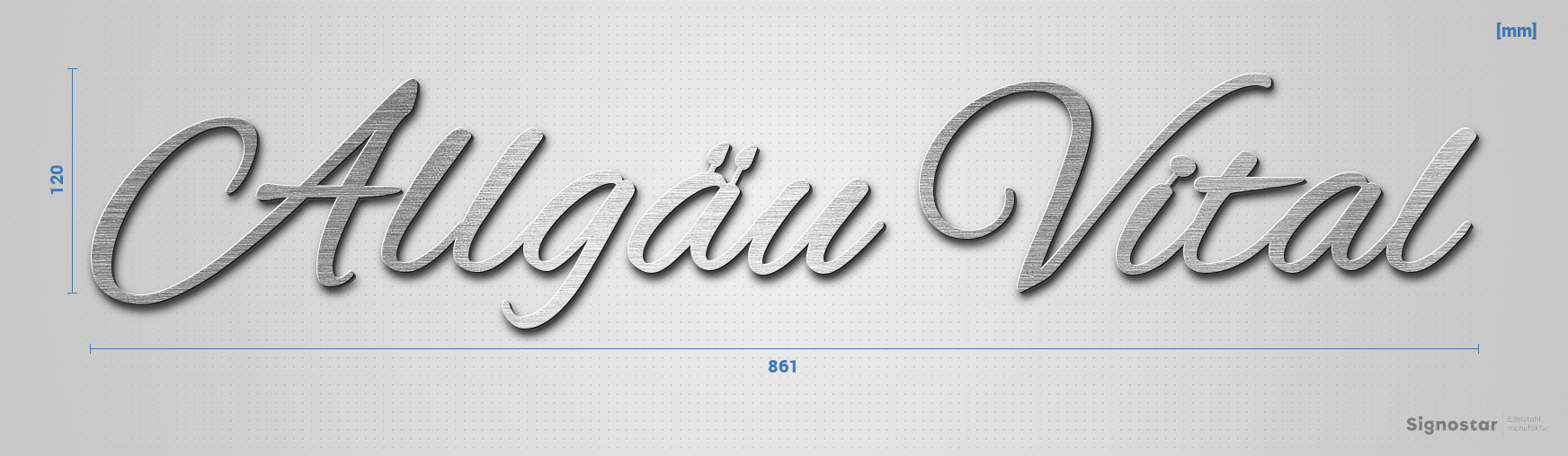 Schriftzug "Allgäu Vital" in Schriftart "Jessari", Edelstahl V2A gebürstet - hochwertig & wetterbest