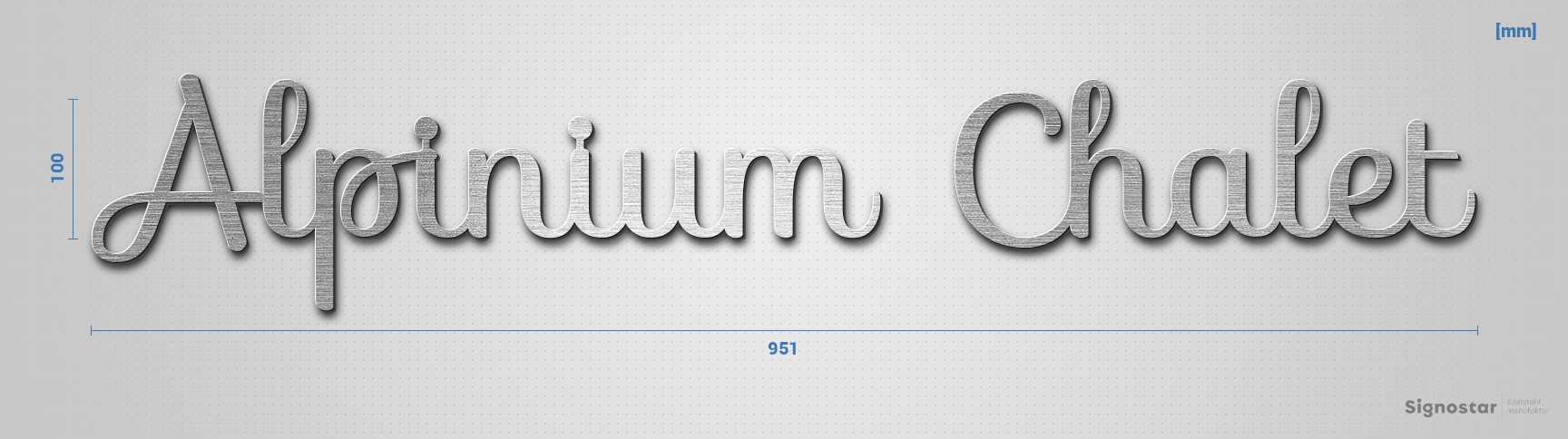 Schriftzug "Alpinium Chalet" in Schriftart "Autumna", Edelstahl V2A gebürstet - hochwertig & wetterb