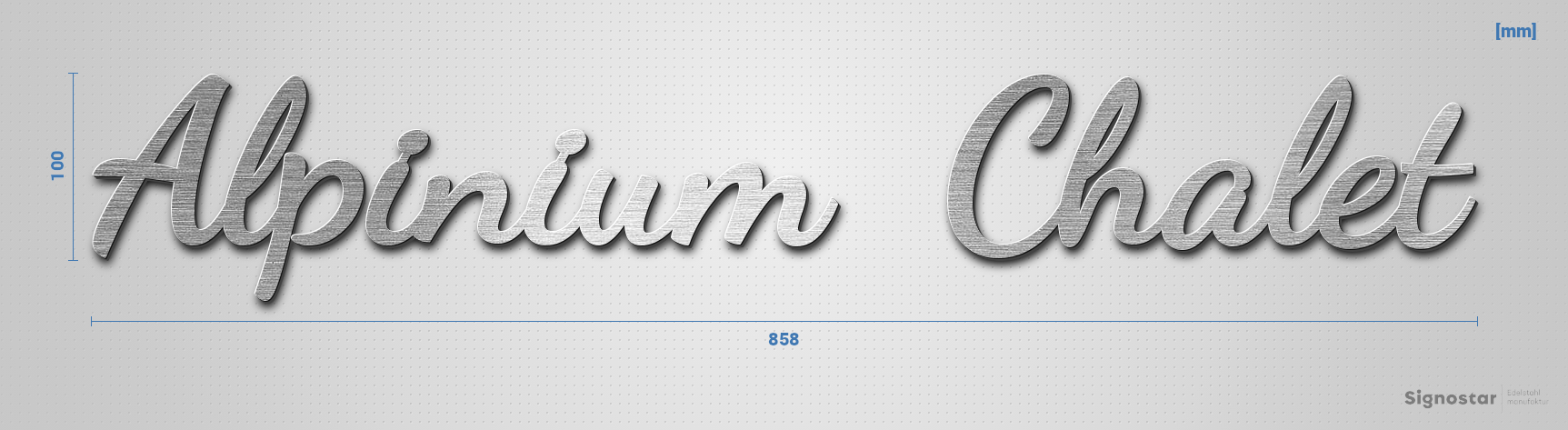 Schriftzug "Alpinium Chalet" in Schriftart "Filigrano", Edelstahl V2A gebürstet - hochwertig & wett