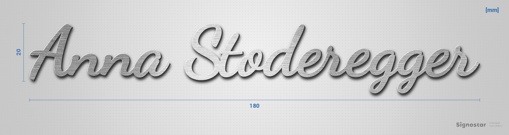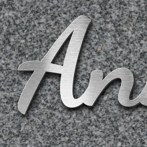 Schriftzug "Anna Stoderegger" in Schriftart "Filigrano", Edelstahl V2A gebürstet - hochwertig & wett