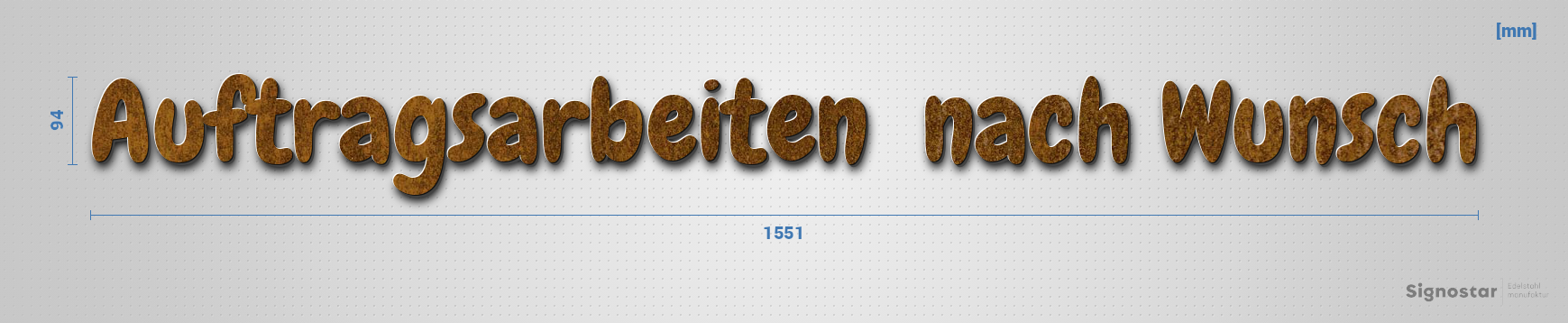 Hochwertiger, witterungsbeständiger Schriftzug "Auftragsarbeiten nach Wunsch" aus unbehandeltem Cortenstahl
