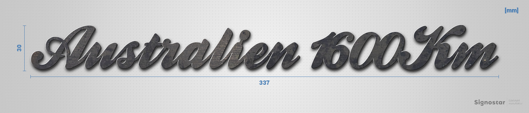 Hochwertiger, witterungsbeständiger Schriftzug "Australien 1600Km" aus unbehandeltem Cortenstahl