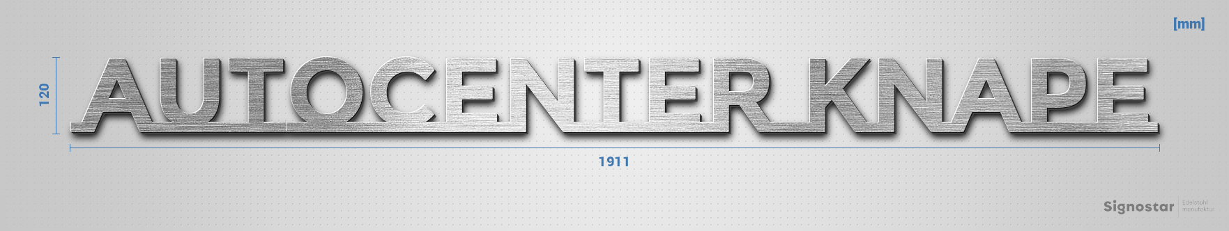 Hochwertiger, witterungsbeständiger Schriftzug "autocenter Knape" aus gebürstetem Edelstahl V2A (1.4301)