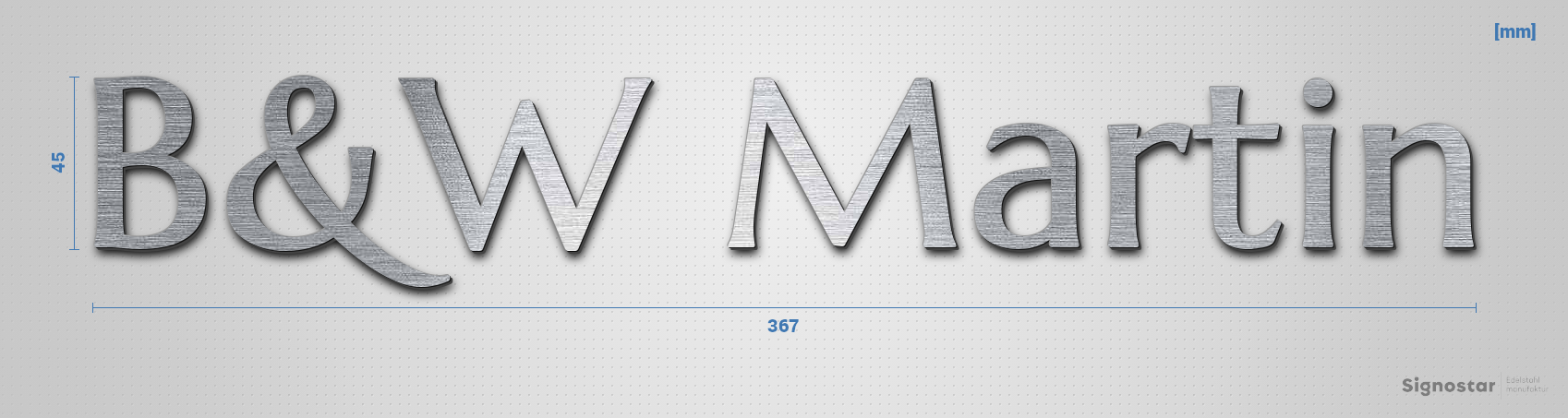 Schriftzug "B&W Martin" in Schriftart "Eternitas", Acryl-Kunststoff in Edelstahl-Optik gebürstet - h