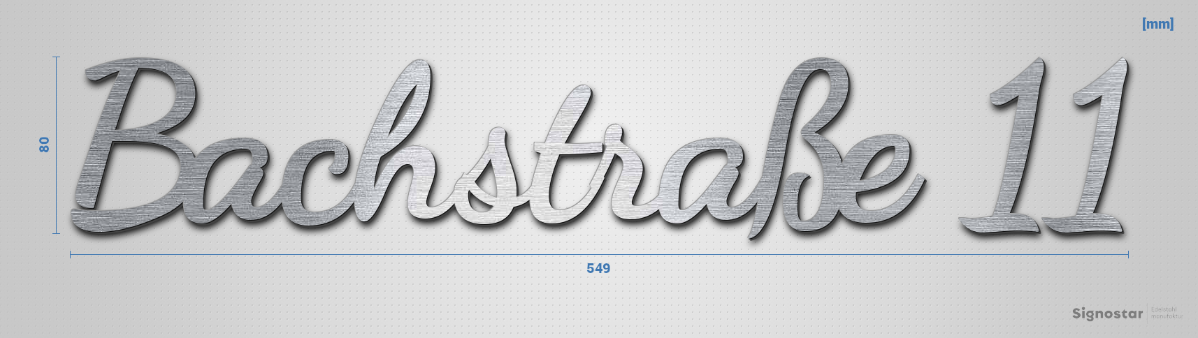 Hochwertiger, witterungsbeständiger Schriftzug "Bachstraße 11" aus Acryl-Kunststoff mit Oberfläche in Edelstahl-Optik, gebürstet