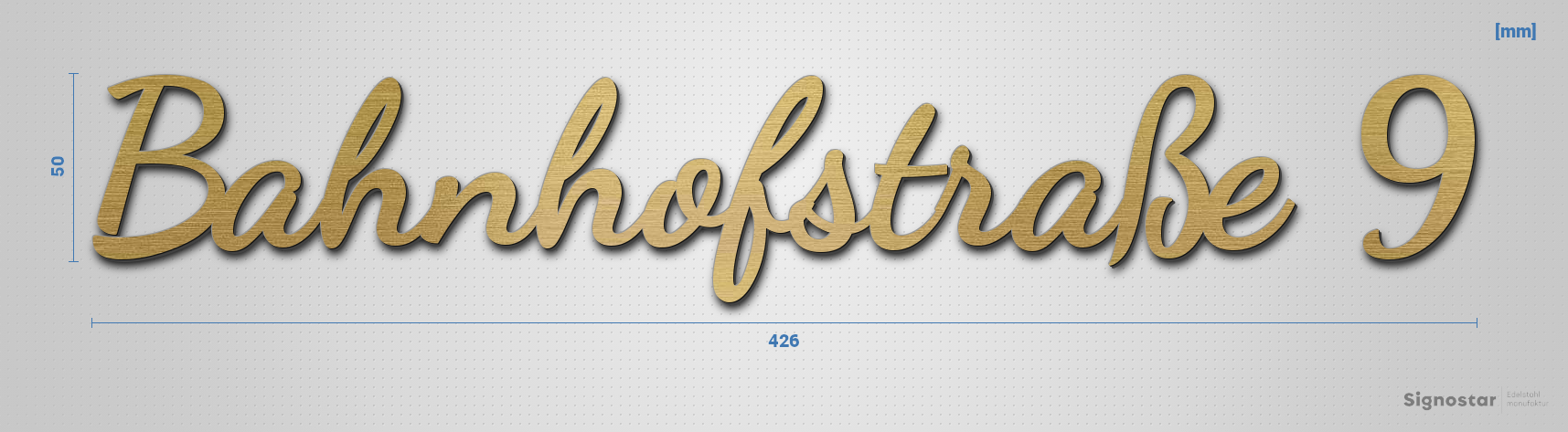 Schriftzug "Bahnhofstraße 9" in Schriftart "Filigrano", Acryl-Kunststoff in Messing-Optik gebürstet