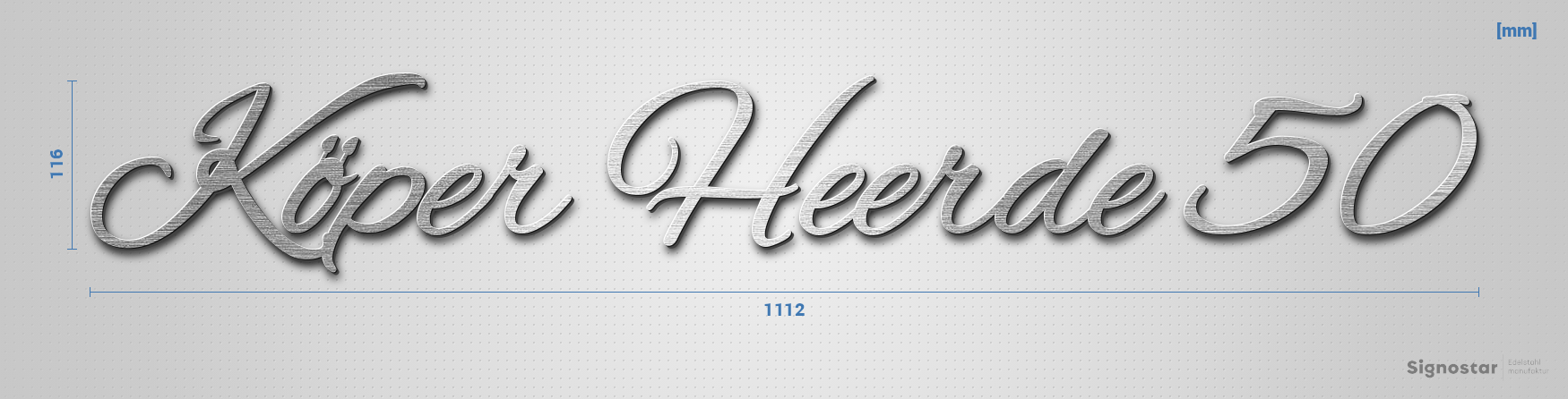 Hochwertiger, witterungsbeständiger Schriftzug "Köper Heerde 50" aus gebürstetem Edelstahl V2A (1.4301)