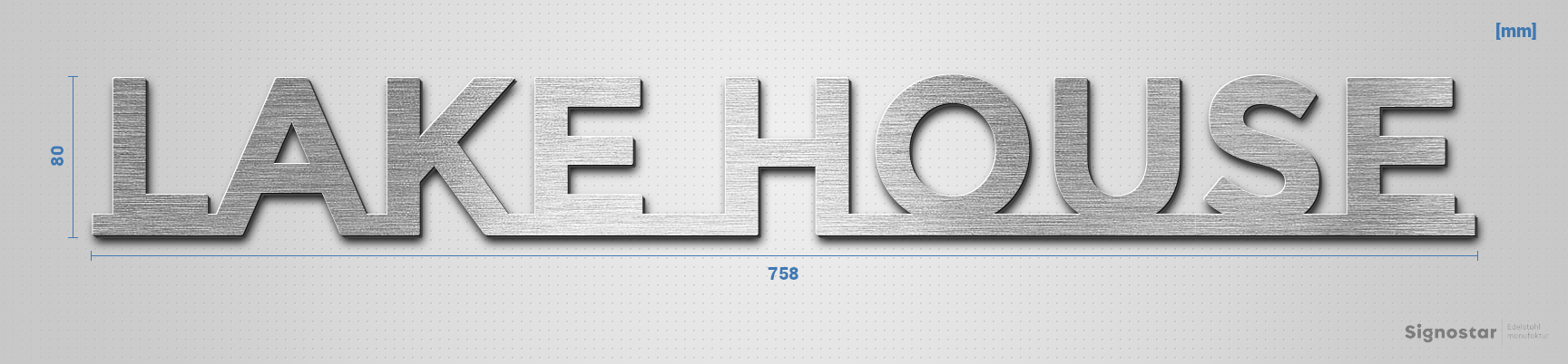 Hochwertiger, witterungsbeständiger Schriftzug "Lake House" aus gebürstetem Edelstahl V4A (1.4571)
