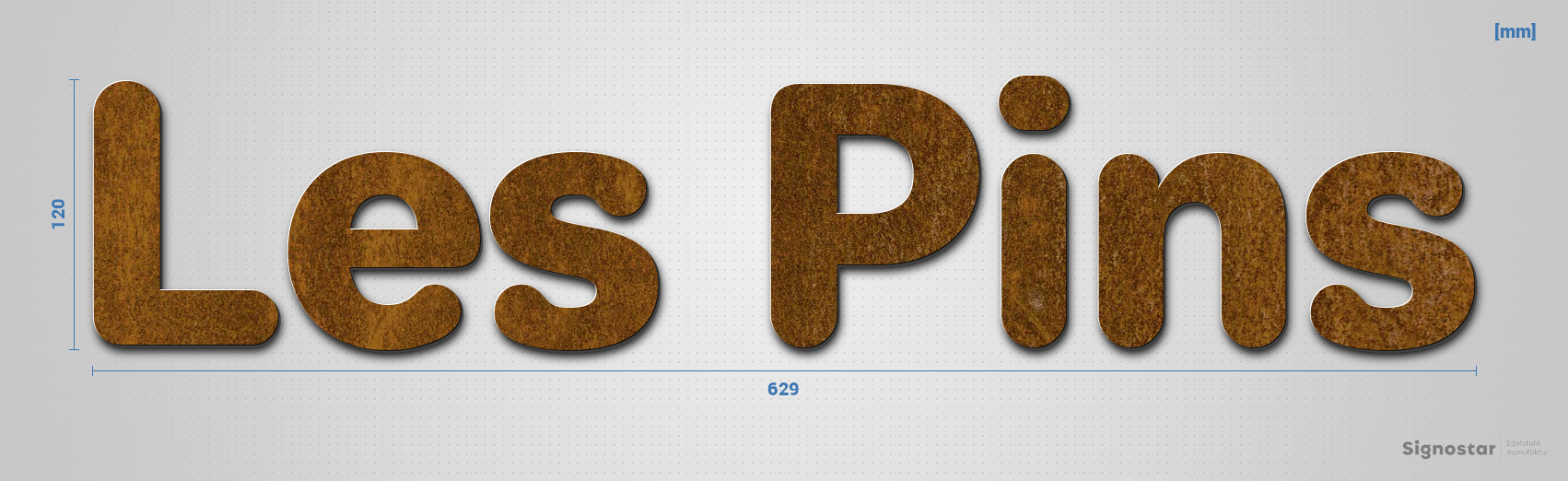 Schriftzug "Les Pins" in Schriftart "Classic", Cortenstahl voroxidiert - hochwertig & wetterbeständi