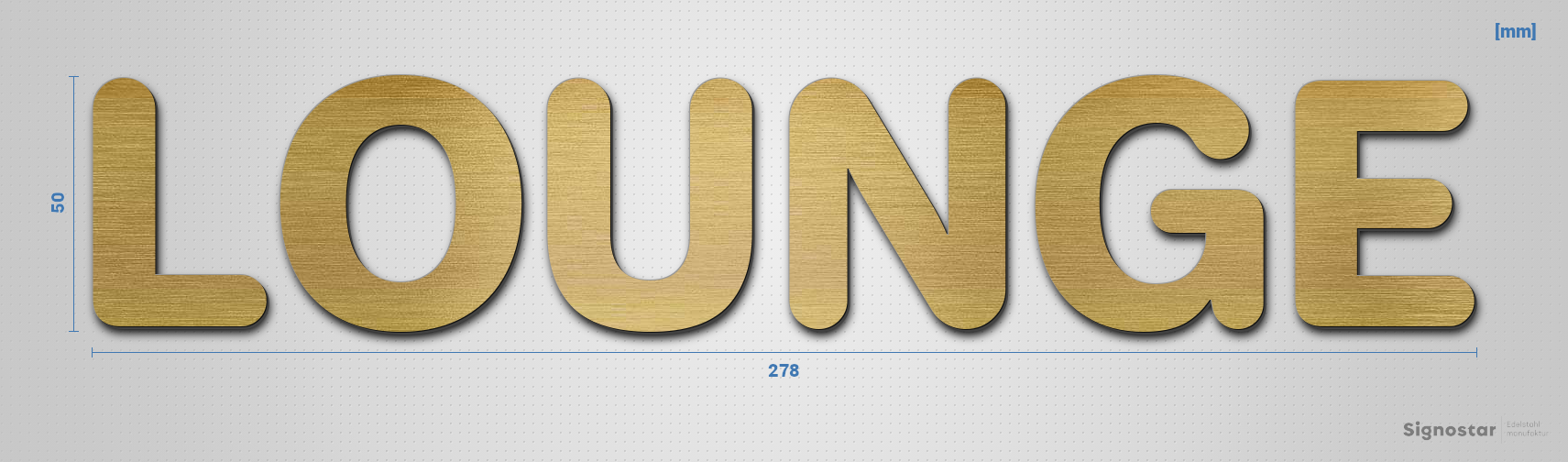 Hochwertiger, witterungsbeständiger Schriftzug "LOUNGE" aus Acryl-Kunststoff mit Oberfläche in Messing-Optik, gebürstet