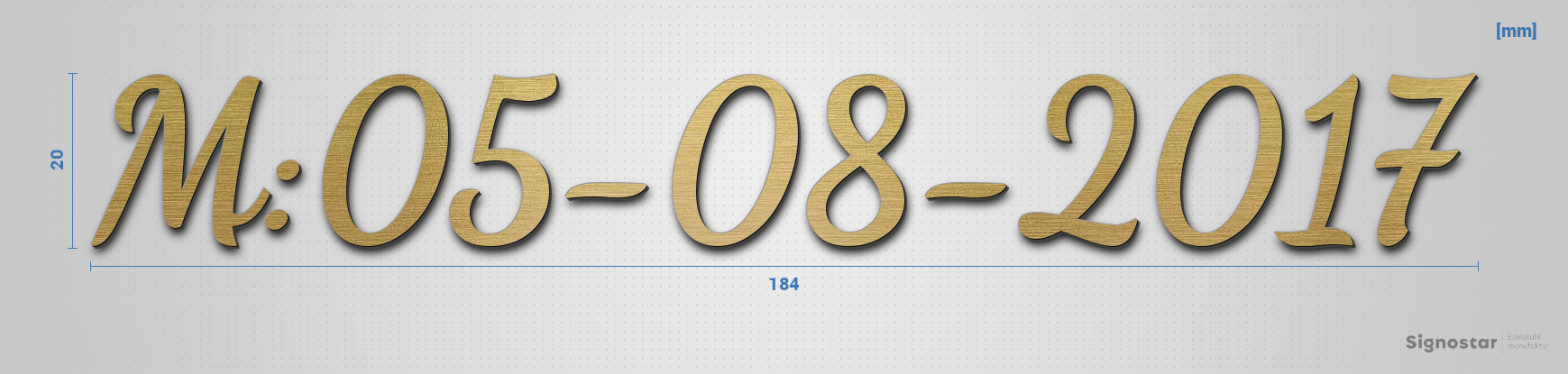 Schriftzug "M:05-08-2017", Acryl-Kunststoff in Messing-Optik gebürstet - hochwertig & wetterbeständi