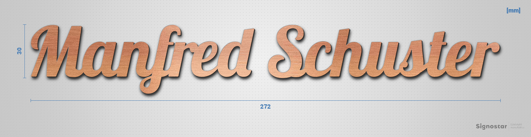 Hochwertiger, witterungsbeständiger Schriftzug "Manfred Schuster" aus Acryl-Kunststoff mit Oberfläche in Kupfer-Optik, gebürstet