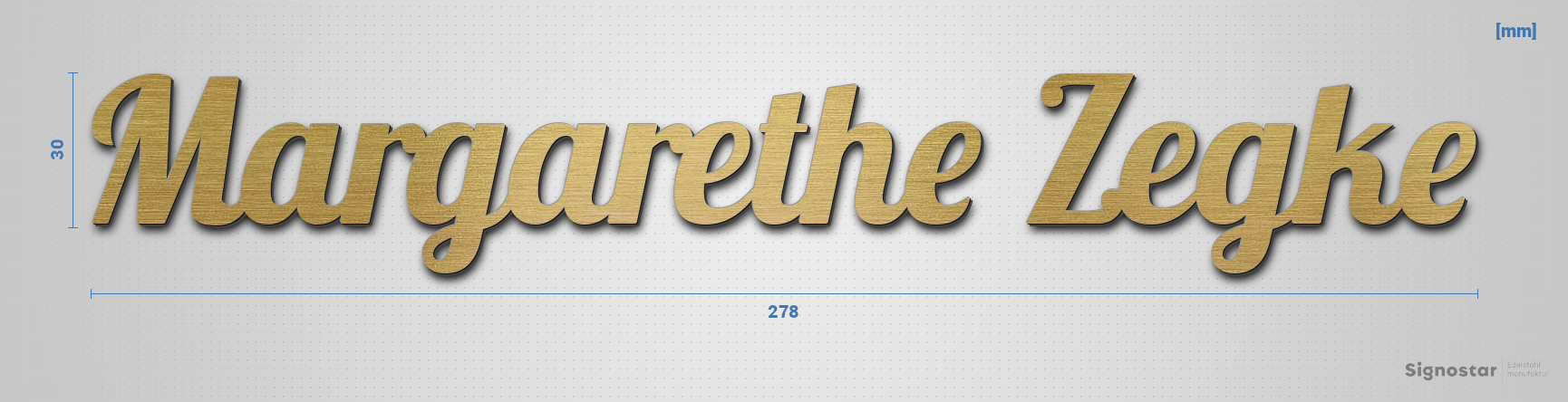 Schriftzug "Margarethe Zegke" in Schriftart "Catdog", Acryl-Kunststoff in Messing-Optik gebürstet -