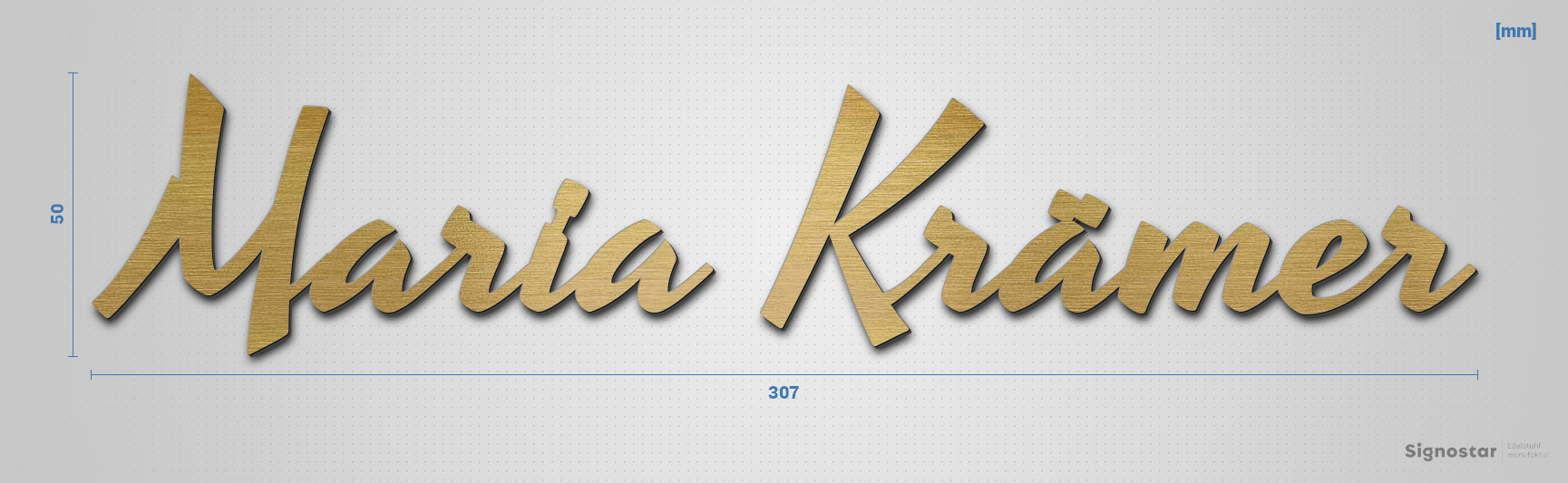 Hochwertiger, witterungsbeständiger Schriftzug "Maria Krämer" aus Acryl-Kunststoff mit Oberfläche in Messing-Optik, gebürstet